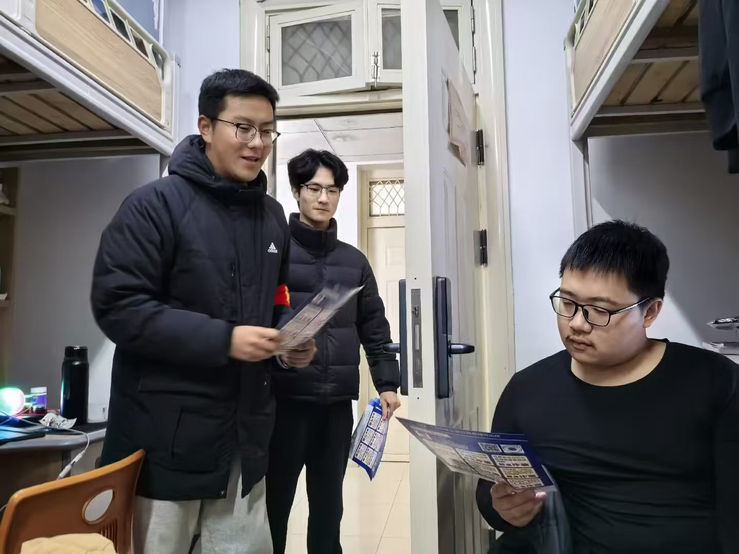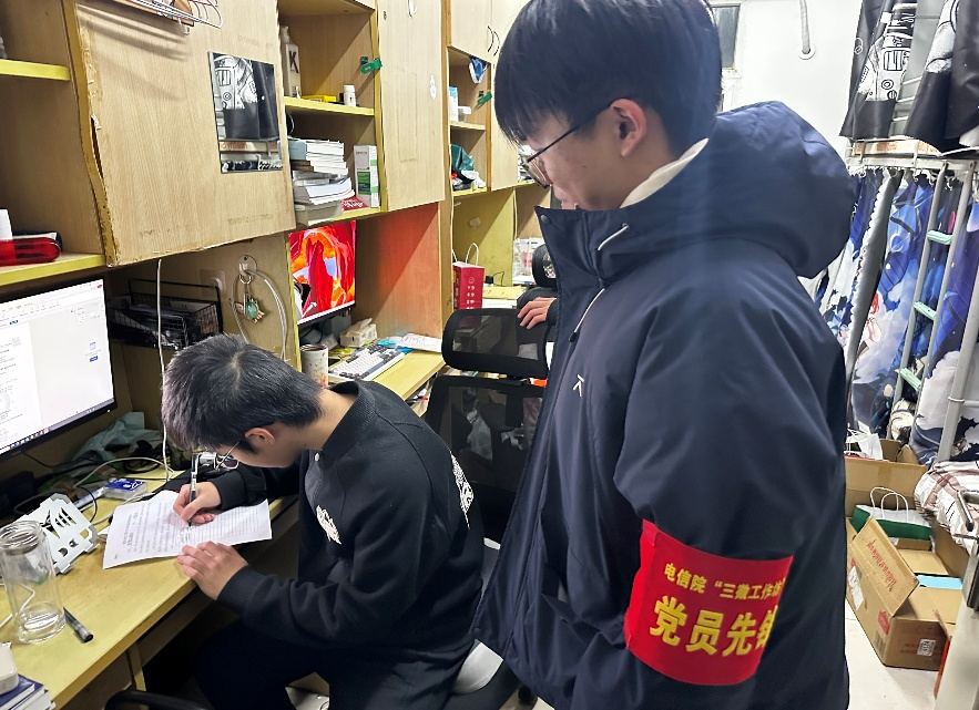 为切实发挥学生党员先锋示范岗的引领作用,让“我为师生办实事”实践活动真正走进学生身边、落到实处,12月中下旬,电信院各学生支部组建党员志愿服务队,深入学生宿舍一线,开展防诈反诈宣传与考试诚信教育主题活动,用暖心服务守护师生财产安全,用正向引导涵养优良考风考纪。