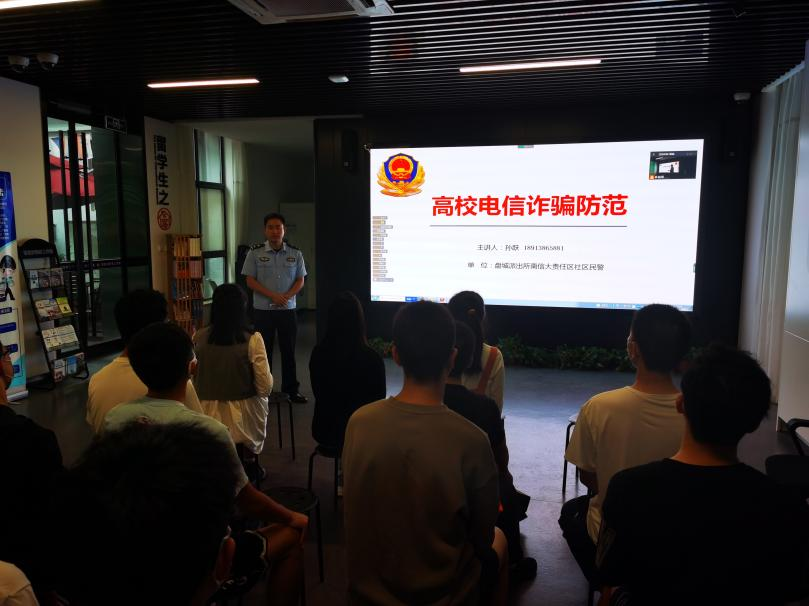 为防止新生被电信诈骗,保障其人身财产安全,提高新生的防范意识与自我保护能力,9月14日下午2点,电信院邀请盘城派出所民警孙跃为2022级新同学开展“高校电信诈骗防范”新生安全教育讲座。讲座由辅导员左香草主持,采取了线上线下相结合的模式。
