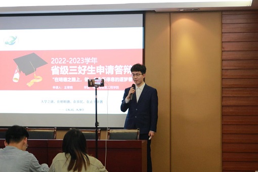 答辩过程中,候选人根据抽签顺序依次上台,每人通过5分钟的PPT充分展示了自己自入学以来在学习成绩、学科竞赛、学生工作、社会实践等方面取得的优异成绩。他们专业课学习扎实,锻炼实践创新能力;他们肩负青年大学生的理想与使命,在疫情中担任志愿者;他们从“三好”的含义讲到“德智体美劳”的具体体现,从实践活动经验分享到个人兴趣爱好,呈现了一场“神仙打架”般的视觉盛宴。先进班集体答辩中,各班汇报了班级的学风建设、班级建设、团学活动等内容,展现出班级的凝聚力和向心力,体现同学们奋发向上的精神风貌。
