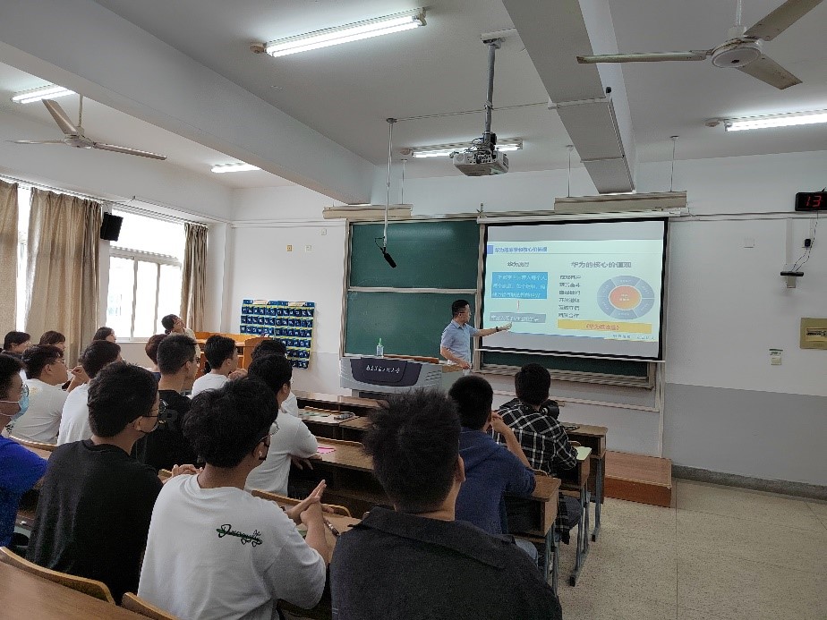 首先班主任和班导们进行了自我介绍并分享了个人学习和工作经验。有着华为工作经历的两位班主任分享了自己学生时代的学习经验,并结合华为工作经历,鼓舞同学们努力学习,接续奋斗。班主任孙兵更是通过PPT形式介绍了华为精神,他希望同学们克服困难,提高学习效率,调整情绪,严格自律,享受科学,充实生活。作为华为班的班导,徐翰文同学学业成绩优异,有着丰富的竞赛经历,生活中还热爱弹钢琴,他表示希望带领同学们在学业方面取得优异成绩,同时全方面发展,成为更好的自己。