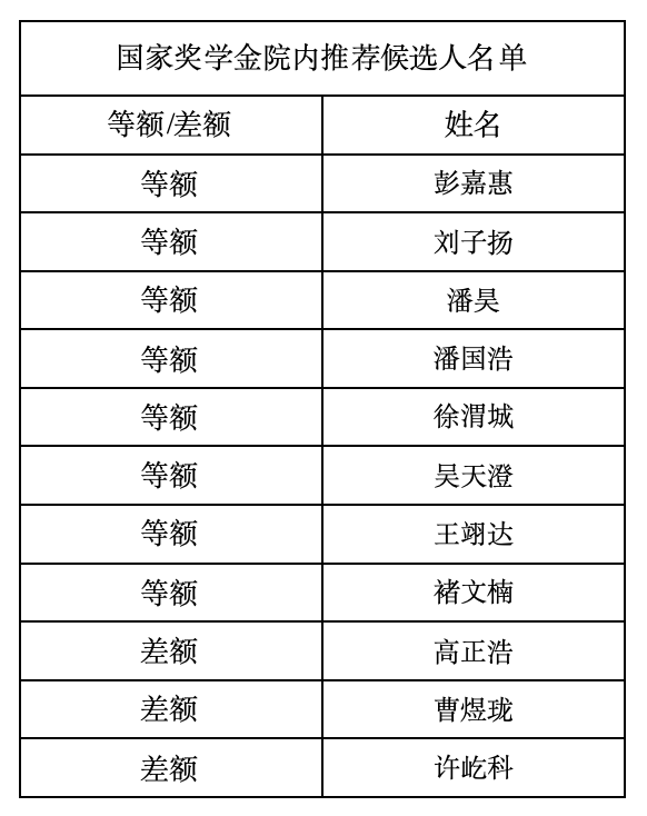 根据《财政部、教育部、人力资源社会保障部、退役军人部、中央军委国防动员部关于印发<学生资助资金管理办法>的通知》(财科教〔2019〕19号)的相关规定,以及《省教育厅关于做好2022年普通高校国家奖学金有关工作的通知》(苏教助函〔2022〕9号)的精神和要求,结合《电子与信息工程学院国家奖学金评比实施细则》,通过个人申请、学院审核、现场答辩等形式综合计算学生的排名,并通过学院讨论最终确定彭嘉惠等8名同学为国家奖学金院内推荐等额候选人,高正浩等3名同学为国家奖学金院内推荐差额候选人,现将名单给予公示: