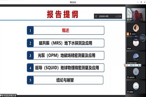 会议伊始,林院士首先开门见山介绍了地下目标探测的关键——量子测量技术。林院士提出,研究量子传感实现精密测量和研究量子磁力仪的灵敏度提升会对精准探测地下目标有很大帮助。随后第二部分林院士介绍了磁共振(MRS)地下水探测及应用,课题组研制的核磁共振(MRS)地下水和矿井/隧道水害直接探测仪器装备已经在多个地区得到实际应用。接着第三部分林院士向大家介绍了光泵(OPM)地磁场精密测量及应用,展示了课题组研制的新型激光氦光泵(OPM)磁力仪样机,实现了pT2级的高精度磁场测量。第四部分林院士通过对超导(SQUID)地球物理精密测量及应用的介绍,引出在超导方面的研究成果,为国家深部探测事业添砖加瓦。