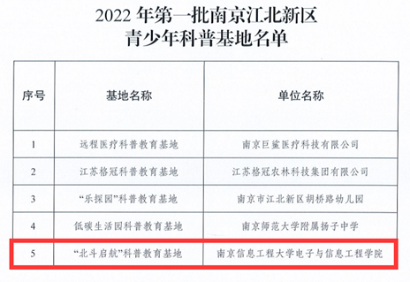近日,南京江北新区管委会科技创新局、南京江北新区管理委员会教育和社会保障局发布了2022年第一批南京江北新区青少年科普基地名单,电信院申报的“北斗启航”科普教育基地作为唯一的高校科普基地成功入选。