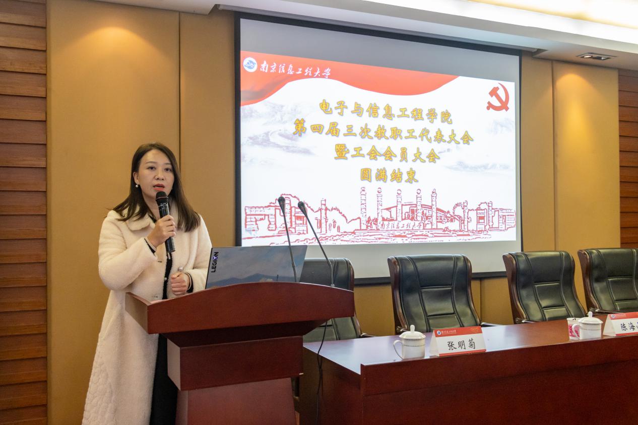 徐萍对电信院工会工作给予指导。她指出,开好“双代会”是学院民主管理和民主监督的基本形式,是落实广大教职工主人翁地位的重要举措,更是集思广益、凝聚共识、推进发展的重要平台。徐萍希望各位代表认真履行职责,以主人翁的姿态,饱满的热情,务实的作风,认真听取并审议每一份文件,充分发扬民主,建言献策;紧紧围绕学校和学院发展的中心任务,打造团结和谐的教工之家,更好地推动学院各项事业健康可持续发展。