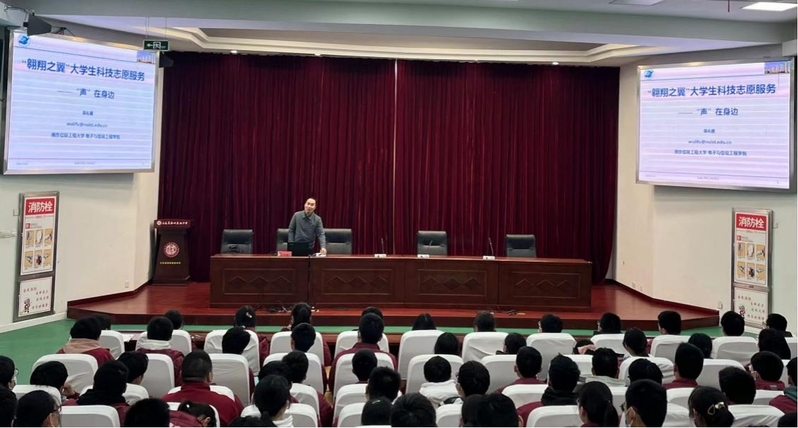 会后,吴礼福教授开展了以“‘声’在身边”为主题的科普讲座,详细阐述了“声”的产生、传播、接收和应用,激发了同学们对科学的向往。讲座内容丰富、吴教授言语风趣,现场互动热烈,同学们收获颇丰。讲座后,祁雪峰详细介绍了我校普通本科招生政策,鼓励广大学子努力学习,积极报考我校。
