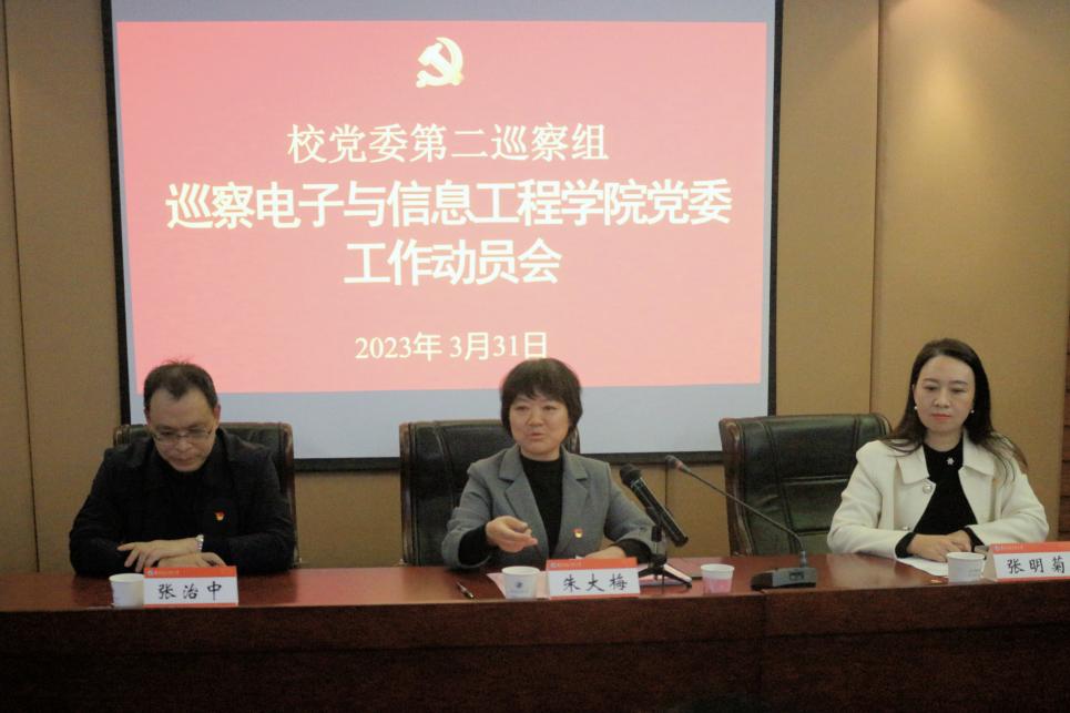 3月31日下午,校党委第二巡察组巡察电子与信息工程学院(以下简称“电信院”)党委工作动员会在学科二号楼N201会议室召开。校党委第二巡察组组长、校党委常委、副校长朱大梅,校党委巡察工作办公室主任汪保安,巡察组副组长许尝君、庞章军,巡察组成员张昳丽、吴鹏飞、杨光友、阙华燕出席会议。电信院领导班子成员、全体教职员工、学生党支部书记、学生党员代表等参加会议。会议由电信院党委书记张明菊主持。