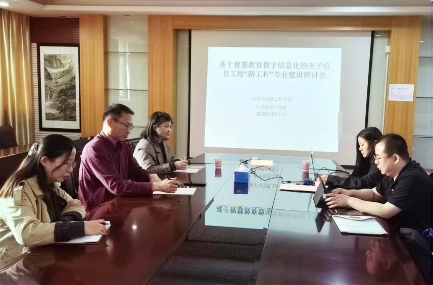 为促进信息技术与教育深度融合,推动现代化信息技术赋能新工科专业建设及教学改革,4月12日下午,北京贝斯林泰岳教育科技有限公司智慧教育课题组成员王少飞、董晓艳莅临我院,举行《基于智慧教育数字信息化的电子信息工程“新工科”专业建设研究与实践》项目交流座谈会。座谈会由电子信息工程系主任张秀再主持,系支部书记周晓彦、教学秘书陈慧参会。