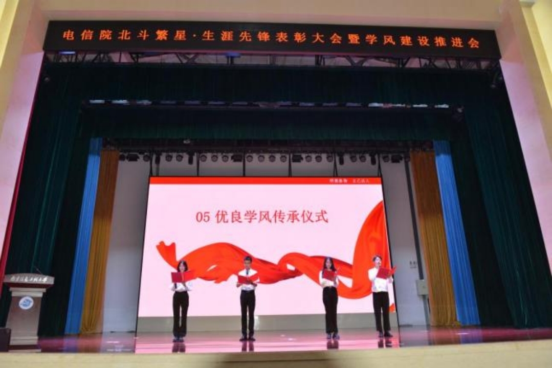 为深入学习贯彻党的二十大精神,推动习近平新时代中国特色社会主义思想主题教育走深走实,进一步落实上级部门关于高校毕业生就业创业工作的决策和部署,传承学院优良学风,发挥榜样引领作用,6月7日晚,电信院北斗繁星•生涯先锋表彰大会暨学风建设推进会在风云剧场举行。电信院院长张治中,党委书记张明菊,副院长刘光杰,党委副书记、副院长叶玉娣出席会议,学院全体系主任、班主任、辅导员,2023届受表彰毕业生,各年级学生代表参会,会议由叶玉娣主持。