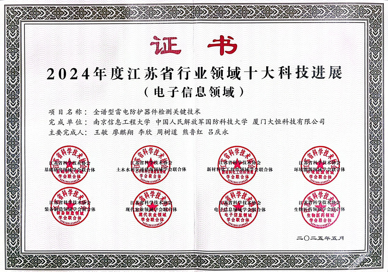 近日,江苏省科协公布了2024年度江苏省行业领域十大科技进展遴选结果。我院王敏教授作为第一完成人的项目“全谱型雷电防护器件检测关键技术”荣获2024年度江苏省行业领域(电子信息领域)十大科技进展奖,该项目第一完成单位为南京信息工程大学,与国防科技大学等单位联合申报。